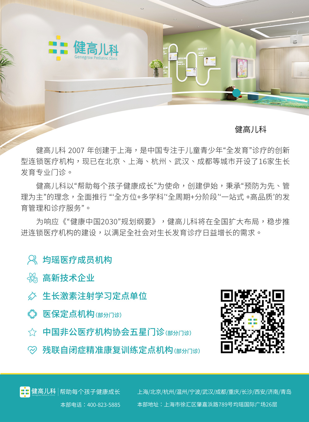 经过十几年的探索与努力,健高儿科已初步形成了符合中国国情的发展模式 ——专注生长发育、医教研协同发展、全国连锁布局。展望未来,健高儿科将不忘初心、坚守使命,致力于为每个孩子提供高品质的“全发育”诊疗服务。